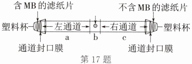 17. 草地贪夜蛾具有趋光性,严重威胁我国粮食安全。水仙花等植物存在天然挥发性物质苯甲酸甲酯(MB),对其他昆虫有很好的驱避效果。苯甲酸甲酯(MB)对草地贪夜蛾的驱避效果怎样呢?研究人员用如图实验装置,将100只草地贪夜蛾的幼虫放入投放处15分钟后观察,结果如表:
