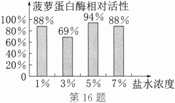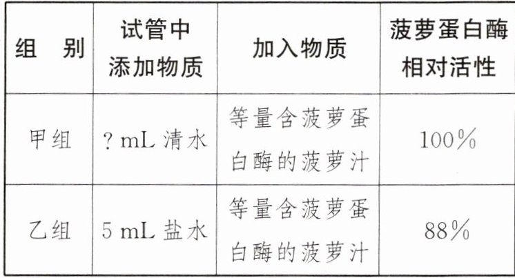 16. (2024·成都模拟)菠萝深受人们喜爱,但食用新鲜菠萝有时会引起口腔麻木或有刺痛感,因为新鲜菠萝中的菠萝蛋白酶能分解口腔黏膜和舌表面的蛋白质。用盐水浸泡后的菠萝比用清水浸泡后的食用起来不适感会减轻。某生物学社团猜想:盐水会影响菠萝蛋白酶的活性。为了验证这一猜想,他们进行了如表所示实验。将试管置于37℃的温水中20分钟,请回答: