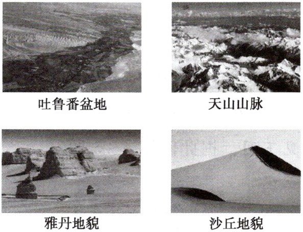①吐鲁番盆地 ②天山山脉 ③雅丹地貌 ④沙丘地貌