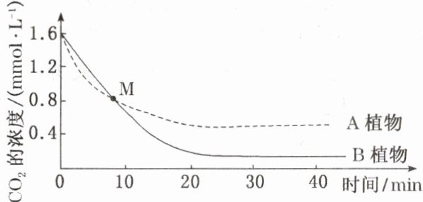 C 据图可知B植物在低浓度CO₂时还可以进行光合作用,所以B植物固定CO₂的能力较A植物强,A正确;10 min之前,B植物所在的容器内CO₂浓度降低,说明光合作用消耗的CO₂量大于呼吸作用产生的CO₂量,B正确;M点时A、B两植物曲线相交,只能说明此时密闭容器中的CO₂浓度相等,而不能说明A、B两植物的固定CO₂速率相等,C错误;20 min后A、B植物不再吸收CO₂,此时表明A、B植物的光合作用固定CO₂的量分别等于各自呼吸作用放出的CO₂的量,D正确。