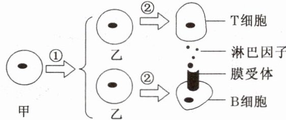 AD 图中细胞甲的分裂能力最强,分化程度最低,A正确;有丝分裂和细胞分化过程中,遗传物质并没有发生改变,B错误;T细胞与B细胞是由同一个细胞经有丝分裂而来的,因此细胞内所含的基因相同,C错误;淋巴因子作用于膜受体,体现了生物膜的信息交流功能,D正确。