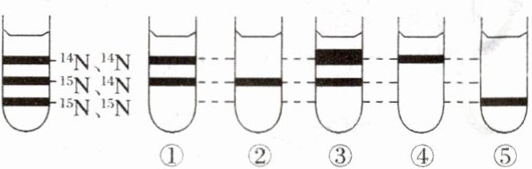 3. 细菌在含$^{15}N$的培养基中繁殖数代后,使细菌DNA的含氮碱基皆含有$^{15}N$,然后再移入含$^{14}N$的培养基中培养,抽取其子代的DNA经高速离心分离,如图①~⑤为可能的结果,下列叙述错误的是 (
