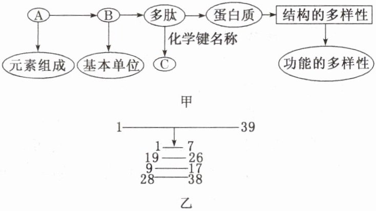 千变万化。(3)乙图中,三十九肽被水解后肽键数量减少