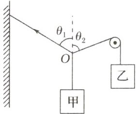 4. 如图所示,悬挂甲物体的细绳拴牢在一不可伸长的轻质细绳上 $ O $ 点处,轻绳的另一端固定在墙上,乙物体通过光滑的定滑轮拴接在 $ O $ 点,甲、乙两物体质量相等,系统平衡时 $ O $ 点两侧的绳与竖直方向的夹角分别为 $ \theta_1 $、$ \theta_2 $。若 $ \theta_1 $ 等于 $ 65^{\circ} $,则 $ \theta_2 $ 等于( )