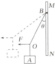 8. 如图所示,物体 $ A $ 用轻质细绳系在竖直杆 $ MN $ 上的 $ B $ 点。现用一水平力 $ F $ 作用在绳上的 $ O $ 点,将 $ O $ 点缓慢向左移动,使细绳与竖直方向的夹角 $ \theta $ 逐渐增大。关于此过程,下列说法中正确的是(
