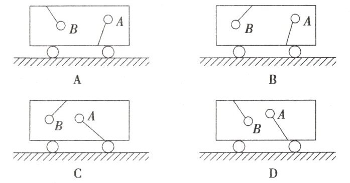 6. 如图,在车厢中的A是用绳拴在底部上的氢气球,B是用绳挂在车厢顶部的金属球,开始时它们和车一起向右做匀速直线运动。若忽然刹车使车向右做匀减速运动,则下列能正确表示刹车期间车内的情况的是 (