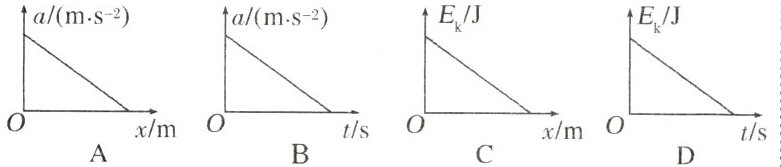 4. 物体在恒定阻力作用下,以某初速度在水平面上沿直线滑行直到停止。以 $ a $、 $ E_{k} $、 $ x $ 和 $ t $ 分别表示物体运动的加速度大小、动能、位移的大小和运动的时间。则以下各图像中,能正确反映这一过程的是 (