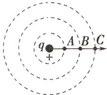 2. 如图所示,三个同心圆是点电荷$q$周围的三个等势面,$A$、$B$、$C$是这三个等势面与一条电场线的交点,且$AB= BC$。$A$、$C两点的电势分别为\varphi _{A}= 10\mathrm{V}和\varphi _{C}= 2\mathrm{V}$,则$B$点的电势(