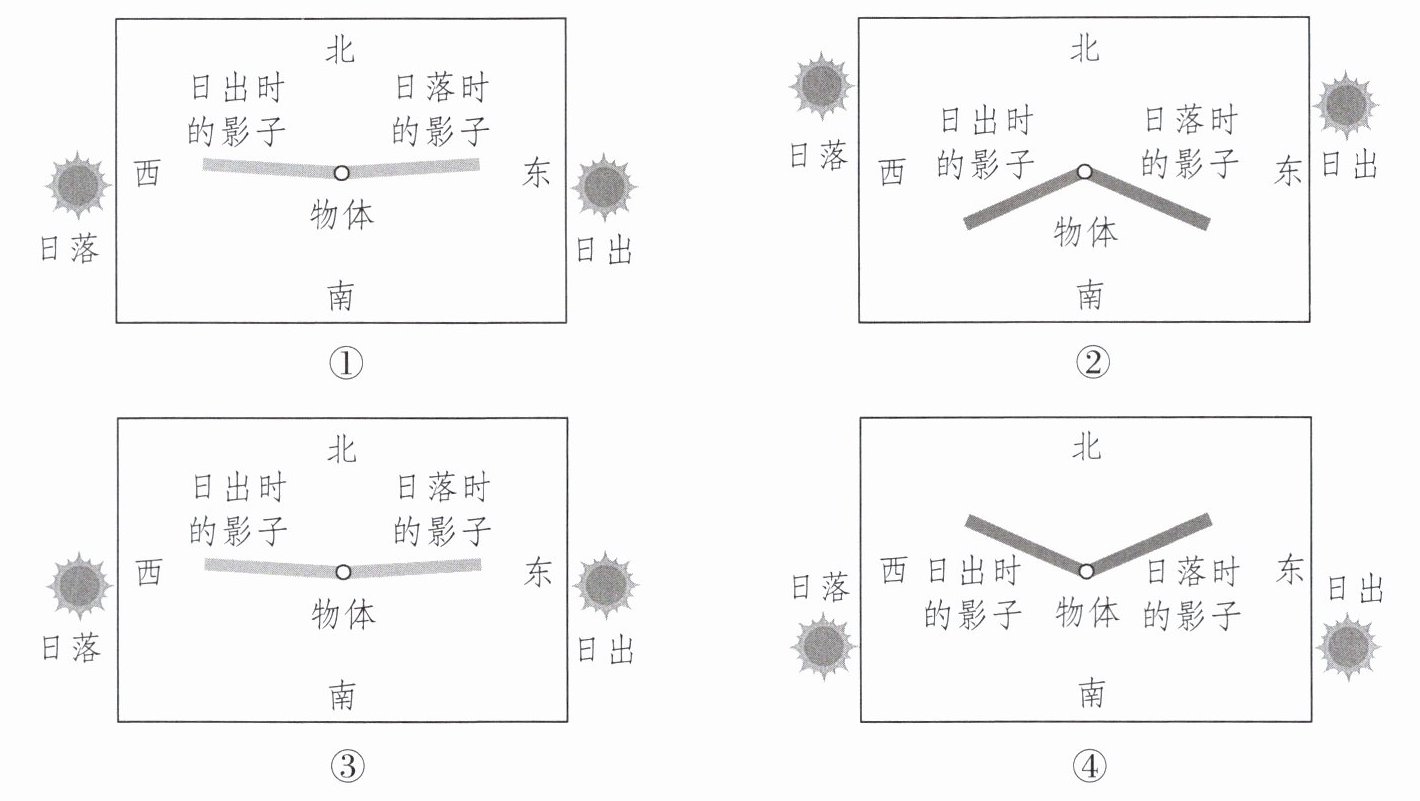 ※下面4张图是日出日落时,赤道附近某地物体影子方向的四季变化示意图。