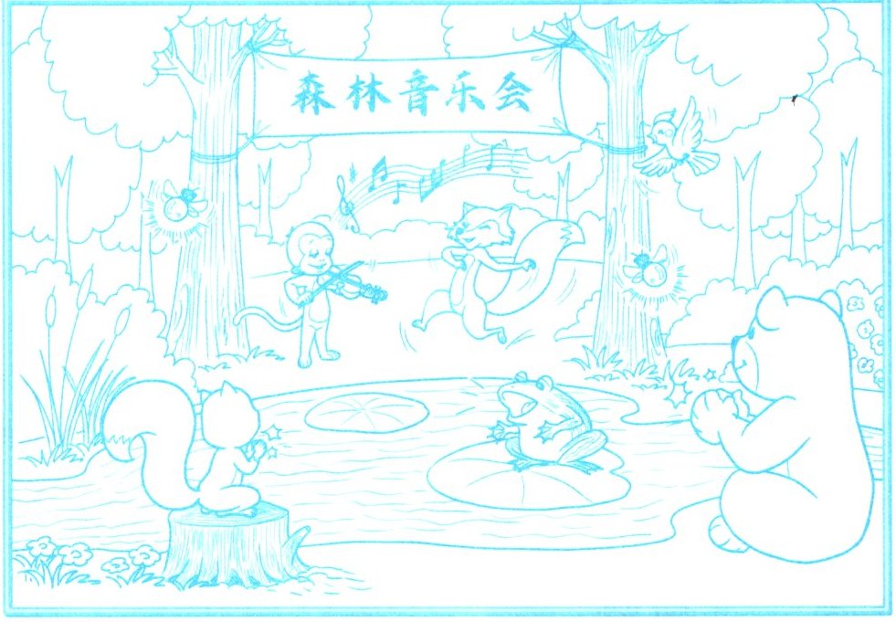 一片森林里正在举行森林音乐会。小鸟在天上飞,青蛙在荷叶上唱歌,萤火虫在草丛中发光。小猴子站着拉小提琴,小松鼠在跳舞,小熊和小松鼠坐着听歌。