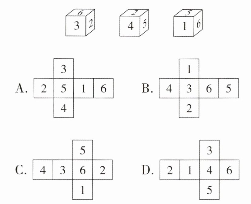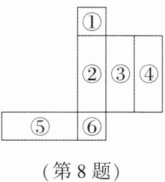 8.B 提示:根据长方体的特征,长方体的6个面一般情况都是长方形(特殊情况有两个相对的面是正方形),相对面的形状和大小相同。通过观察长方体的展开图可知:⑥和①相对、②和④相对、③和⑤相对。如果从前面看到的是⑥,从左面看到的是②,则从上面看到的是③。