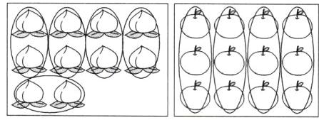 这些桃子的$\dfrac{2}{5}$是( )个。 这些苹果的$\dfrac{3}{4}$是( )个。