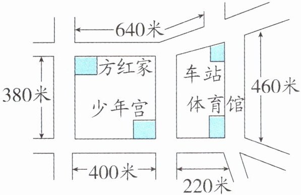 3.下图中,从方红家到什么地方刚好是1 千米远?请你把经过的路线画出来。(忽略道路的宽度)