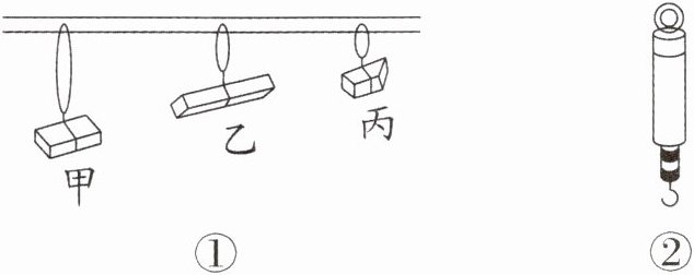 1. (1)新趋势 学科融合 如图①,三根同样长的橡皮筋依次挂着3件重物甲、乙、丙,其中最重的是( )。