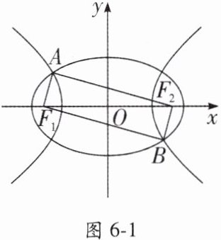 【典例2】如图6-1,$F_{1},F_{2}是椭圆C_{1}:\frac {x^{2}}{4}+y^{2}= 1与双曲线C_{2}$的公共焦点,$A,B分别是C_{1},C_{2}$在第二、四象限的公共点.若四边形$AF_{1}BF_{2}$为矩形,则$C_{2}$的离心率是(
