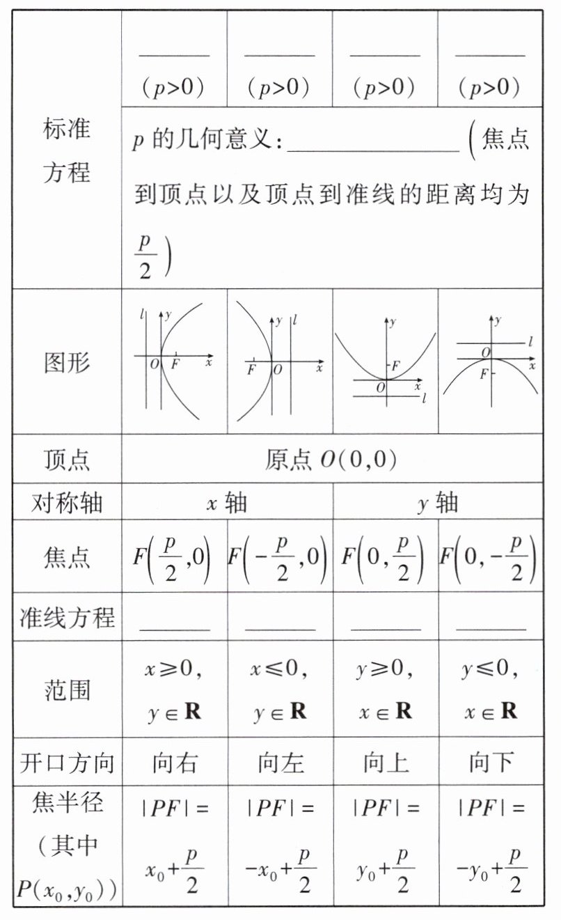 $y^{2}=2px$ $y^{2}=-2px$ $x^{2}=2py$ $x^{2}=-2py$ 焦点F到准线l的距离 $x=-\frac{p}{2}$ $x=\frac{p}{2}$ $y=-\frac{p}{2}$ $y=\frac{p}{2}$