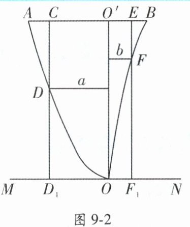【典例 2】某地准备在山谷中建一座桥梁, 如图 9 - 2 所示, 谷底 $ O $ 在水平线 $ MN $ 上, 桥 $ AB $ 与 $ MN $ 平行, $ OO' $ 为铅垂线 $ (O' $ 在 $ AB $ 上). 经测量, 左侧曲线 $ AO $ 上任一点 $ D $ 到 $ MN $ 的距离 $ h_{1}(m) $ 与 $ D $ 到 $ OO' $ 的距离 $ a(m) $ 之间满足关系式 $ h_{1} = \frac{1}{40}a^{2} $; 右侧曲线 $ BO $ 上任一点 $ F $ 到 $ MN $ 的距离 $ h_{2}(m) $ 与 $ F $ 到 $ OO' $ 的距离 $ b(m) $ 之间满足关系式 $ h_{2} = -\frac{1}{800}b^{3}+6b $. 已知点 $ B $ 到 $ OO' $ 的距离为 $ 40m $.