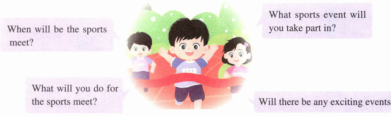 One possible version: The sports meet The sports meet is my favourite school event. We will have a sports meet at school in May. There will be many exciting events on that day, such as the 100-meter race, the 4×100 m relay, the high jump and the long jump. And there will be some funny events, too, like the egg-and-spoon race, the sack race and the tug-of-war. I will take part in the 100-meter race. I will buy a pair of comfortable sports shoes for the competitions. I will also practice running hard. I want to win a prize. I will have a lot of fun.