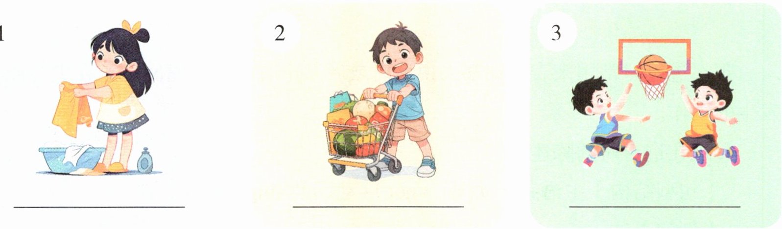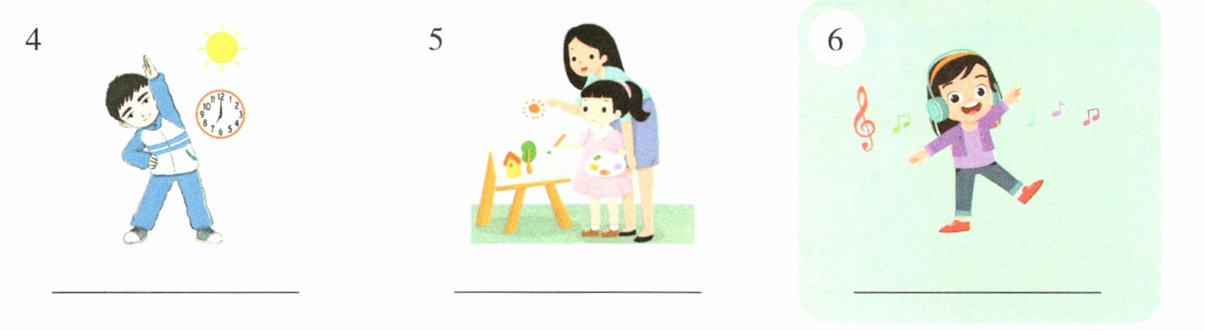 1. wash clothes 2. go shopping 3. play basketball 4. do morning exercises 5. take/have an art class 6. listen to music