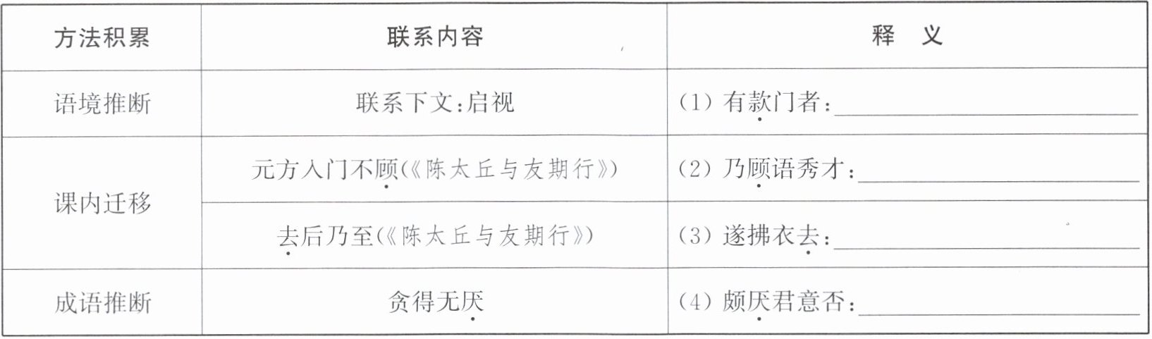 12.(1)敲,叩 (2)回头看 (3)离开 (4)满足13. 从梁间锵锵而下/势如骤雨/广丈之舍/约深三四尺余14. B 解析:结合文章可知:狐仙面对秀才变出钱的要求时,开始是沉默不语,后来笑着说不是难事,由此可见,狐仙并非真心实意答应秀才的要求,他不可能会说出“让老夫施法,助君脱贫”这种话。故选B。15. 示例:A 此处“笑”有“嘲笑”的意思,秀才想要狐仙施法帮助他脱贫,狐仙本就“默然,似不以为可”,当想要不劳而获的秀才没能如愿而怒斥狐仙时,狐仙嘲笑其可耻的行为,不屑与之为伍。“笑”符合情节发展及狐仙正义的性格,且增强了讽刺效果。