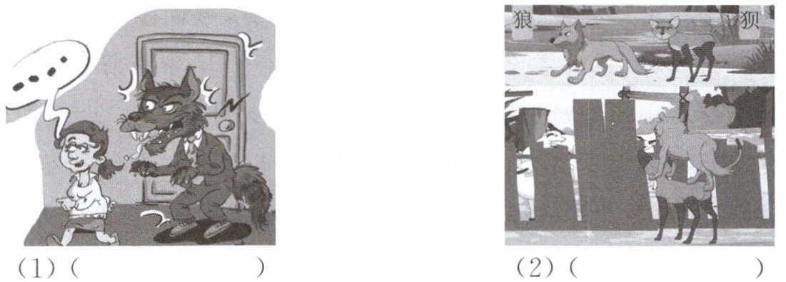 16. [成语积累]活动中,小丽同学搜集到两幅图,可她猜不出与图片相关的狼的成语,请你告诉她,并填一填。