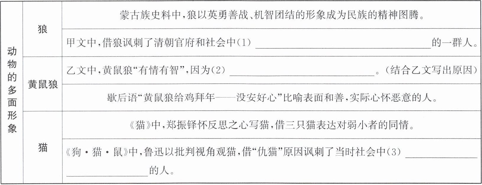 D. [课外拓展]中国传统文化中“狼”和“黄鼠狼”的形象多是负面的,关于它们的成语和俗语也多为贬义,比如:狼狈为奸、狼心狗肺;黄鼠作乱,千军难敌;黄鼠狼进宅——来者不善。