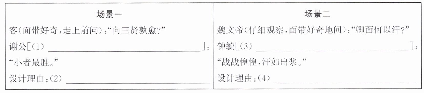 18. 《世说新语》的语言精练含蓄,隽永传神。明代胡应麟说:“读其语言,晋人面目气韵,恍然生动。”请你展开联想与想象,为下面两个场景设计人物对话时的神态、动作、心理活动,并说明设计理由。