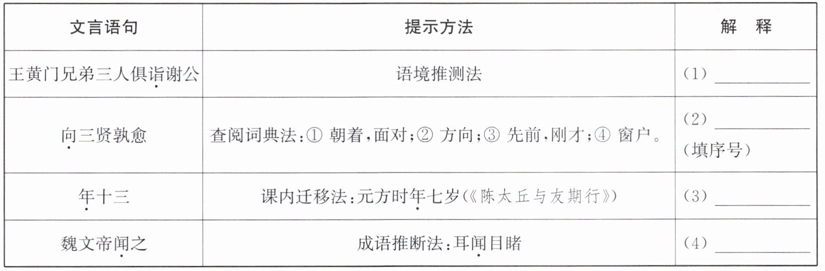16.(1)访问,拜访 (2)③ (3)年龄 (4)听说 17.(1)贤明的人话少,浮躁的人话多。 (2)(魏文帝)又问钟会:“你为什么不出汗?” 18. 示例:(1)抬眼望向门口,淡淡地说 (2)因谢公早知三人中“小者最胜”,故谢公在回答客人的问题时,望着三人离去的方向,内心平静,语气平淡。 (3)害怕、不敢抬头 (4)因钟毓见到魏文帝恐惧、害怕得发抖。 19. 甲文可选人《品藻》篇,《品藻》篇指对人或事物的认识和鉴别。谢安以“吉人之辞寡,躁人之辞多”推断王子敬为兄弟三人中的最佳者,正是对人的鉴别。乙文钟会沉稳,善于应变。《言语》篇讲的是“人的口才辞令”内容,故可归入《言语》篇。