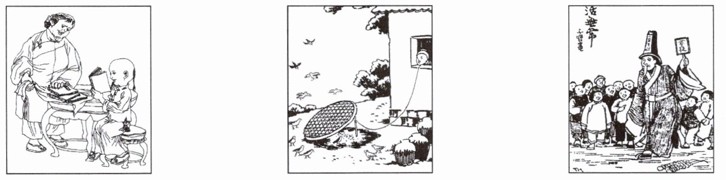 4. 小语向同学们展示了出自《朝花夕拾》的三幅插图。请你根据这三幅插图的画面内容,选择出相对应的文章名称。