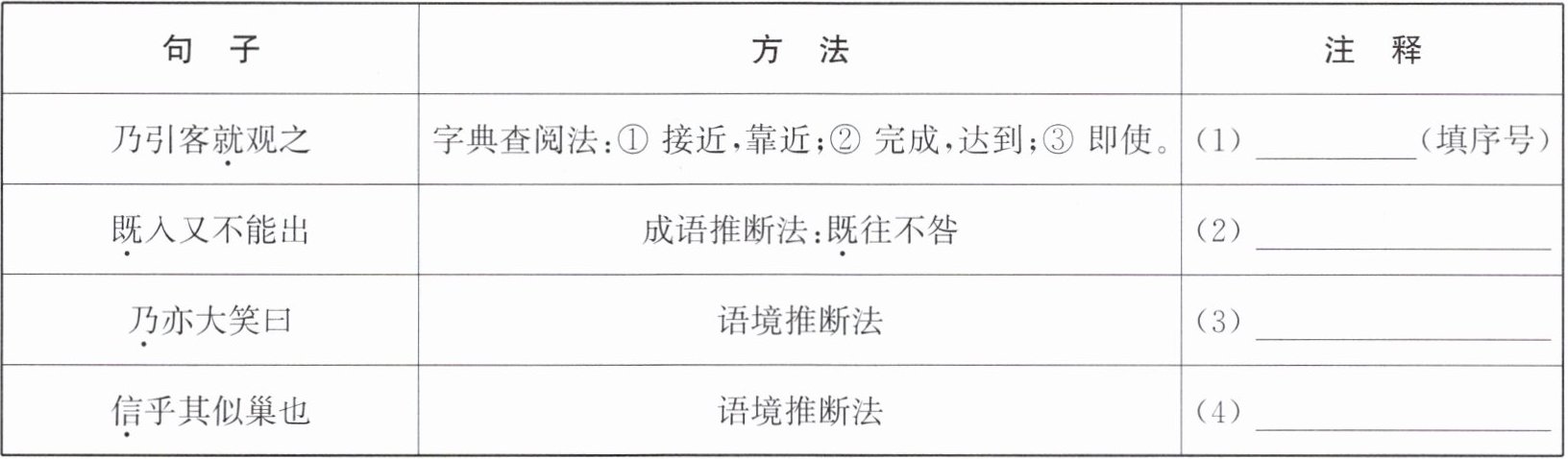 14.(1)虽年老但仍刻苦读书 (2)藏书很多、凌乱难行 (3)第一处,陆游是一种自我解嘲的笑;第二处,客人是遇到知己的开心的笑。15.(1)① (2)已经 (3)于是 (4)确实16. 客人不来拜访,妻子儿女不相见,而且风雨雷雹等天气变化,也都不知道。17. 归隐乡村,坚持读书,心系人民。[乙参考译文] 我的屋子里,有的书堆在书橱上,有的书陈列在前面,有的书放在床上当枕头,抬头低头看着,四周环顾下来,没有无书的地方。我的饮食起居,病痛呻吟,悲伤、忧愁、愤怒、感叹,不曾不与书在一起。客人不来拜访,妻子儿女不相见,而且风雨雷雹等天气变化,也都不知道。偶尔想要站起来,但杂乱的书围绕着我,像堆积着的枯树枝,有时到了不能行走(的地步),就自己笑自己说:“这不就是我所说的书巢吗?”于是带领客人走近看(当时的情形)。客人刚开始不能够进入屋子,已经进到屋中又不能出来,于是(客人)也大笑着说:“这确实是像书巢啊!”