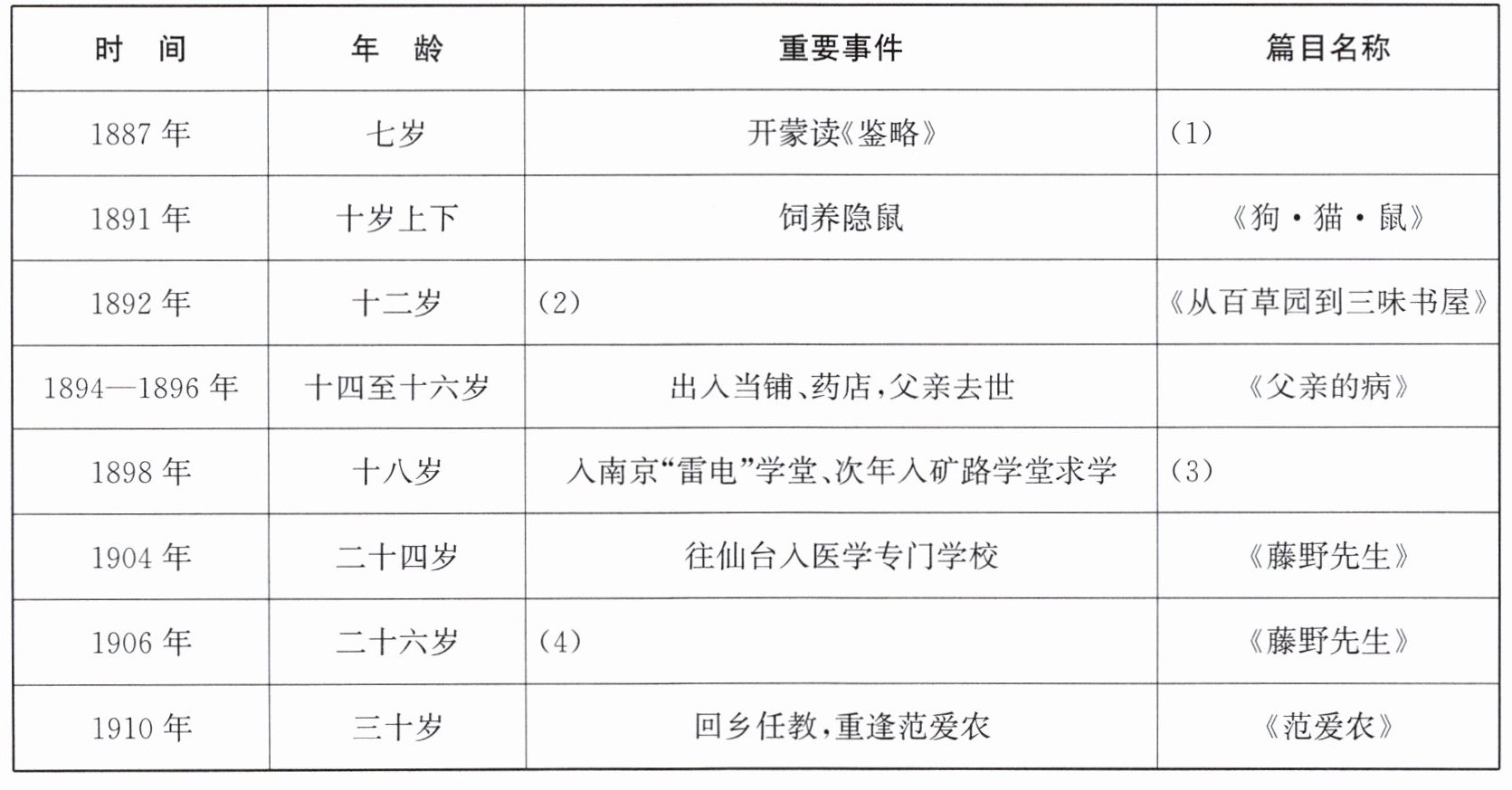 4. 根据《朝花夕拾》的内容,补充完善“鲁迅成长史”表格。