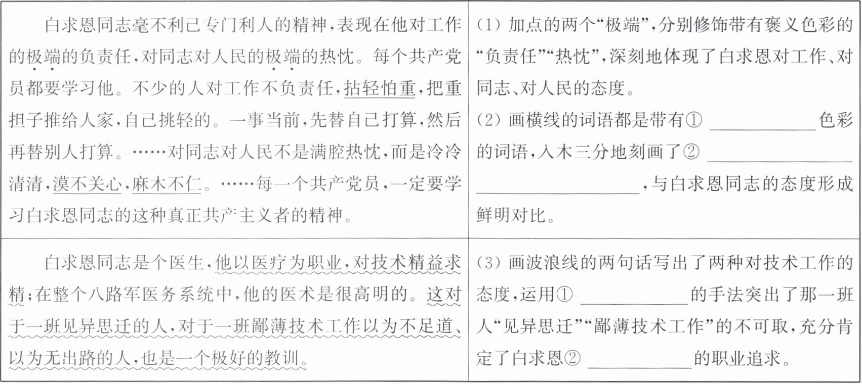 18.(2)① 贬义 ② “不少的人”对工作、对同志、对人民的消极态度 (3)① 对比 ② 精益求精 19. 示例:(1)三位人物都具有高度的责任感和无私奉献的精神。白求恩对工作“极端的负责任”“毫不利己专门利人”;许渊冲笔耕不辍,坚持翻译,只为“把一个国家创造的美,转化为世界的美”;叶嘉莹孜孜不倦,兢兢业业,将中国古诗词的美带给年轻人、传给世人,倾其所有推动古典文学的研究与发展。 (2)同学们,大家好!榜样人物常给我以精神指引,例如医者仁心的国际主义战士白求恩、中国翻译界的泰斗许渊冲、传承中国古典诗词精粹的学者叶嘉莹,他们“择一事,终一生,不为繁华易匠心”,是值得我学习的模范,他们激励我心怀理想,脚踏实地,努力拼搏,不断前行!