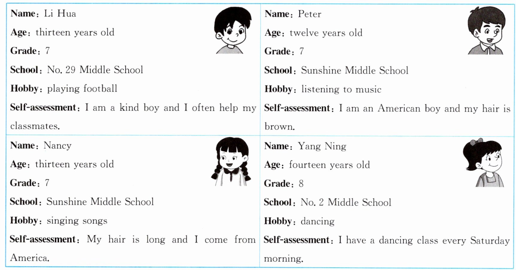 1. Li Hua and Nancy. 2. Every Saturday morning. 3. Li Hua. Because he is a kind boy.(言之有理即可)