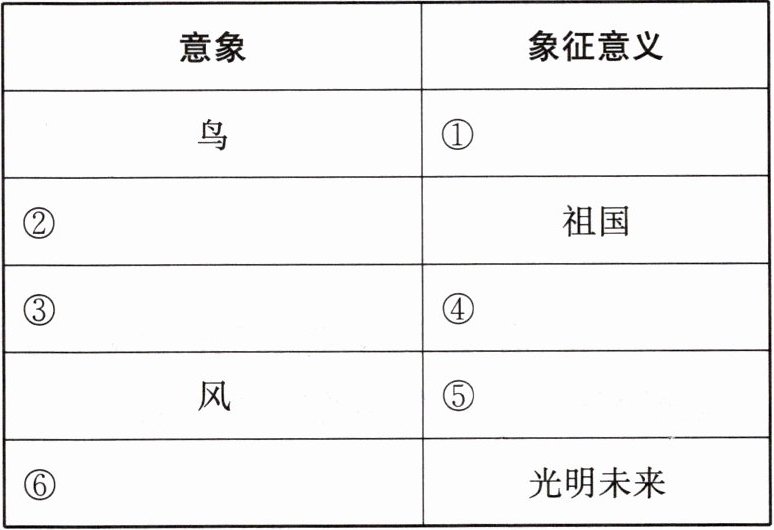 1. 阅读全诗,找出诗中的意象,并体会其象征意义。完成下面的表格。