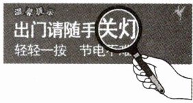 4. (北京中考)小京通过焦距为 $ 10 \, cm $ 的凸透镜看到了提示牌上“关灯”两字放大的像,如图所示。下列说法正确的是(