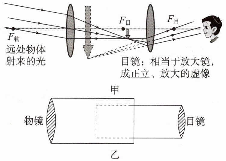 (1) 如图甲所示,物镜的成像点到物镜的距离大于物镜的焦距,小于物镜的 2 倍焦距,且成像点到目镜的距离小于目镜的焦距。由于观察远近不同的物体时,像点在移动,需要调节两凸透镜间的距离,故镜筒要设计成两段,使其可调节,如图乙所示。