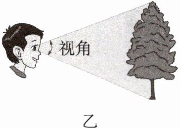 反射式天文望远镜中有一个很大的凹面镜,口径可达数米。利用凹面镜能够把来自遥远宇宙空间的微弱星光进行②,便于观测。我们能否看清一个物体,取决于物体对我们的眼睛所成的视角(如图乙所示)的大小。物体对眼睛所成视角的大小不仅和物体本身的大小有关,还和物体到眼睛的距离有关。
