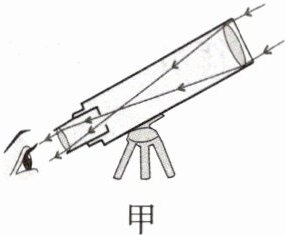 有一种望远镜是由两组凸透镜组成的。靠近眼睛的叫作目镜,靠近被观测物体的叫作物镜(如图甲所示)。物镜的作用是使远处的物体在焦点附近成①像,目镜的作用相当于一个放大镜,用来把这个像放大。