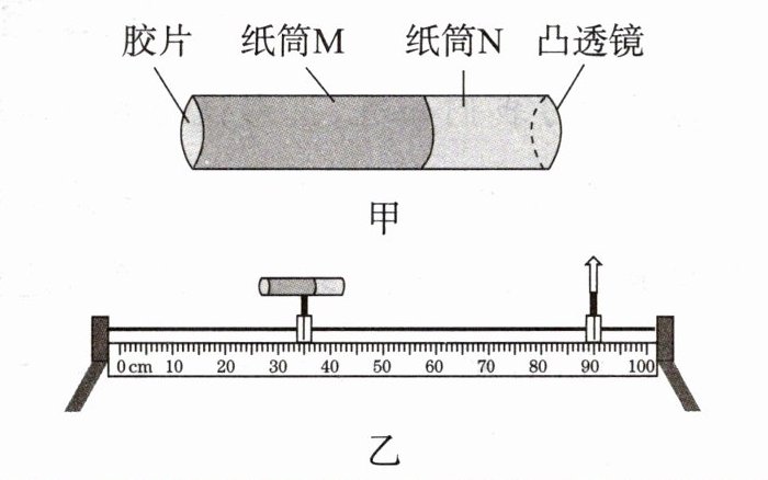 16. 小佳用自制简易照相机模型研究照相机成像原理。如图甲所示,该模型由两个纸筒M、N组成,M正好套在N的外面,并能进行抽拉。在纸筒M的一端贴上胶片,把凸透镜固定在纸筒N的一端。小佳同学将此模型和发光体(物高$h = 6cm$)固定在光具座上进行了三组实验,如图乙所示,实验步骤和操作均正确,并将每次实验测得的物距$u$、像距$v$、像高$h'$等分别记录在如下表格中。$f = 15cm$。