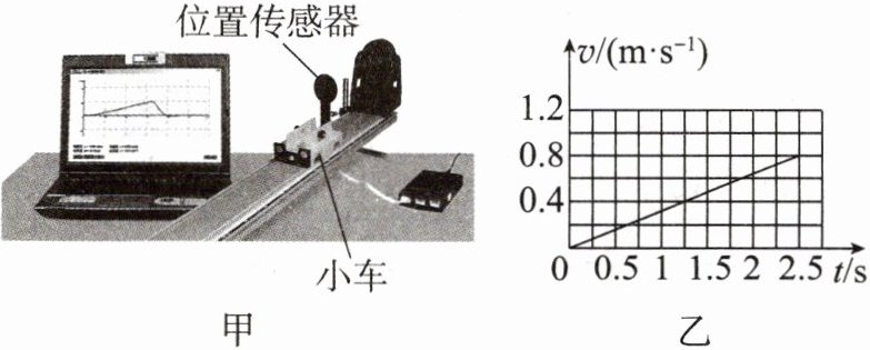 5. 如图甲所示,小明用位置传感器测量小车运动的速度。小车的v-t图像如图乙所示,通过图乙可以看出小车在斜面上滑下时是