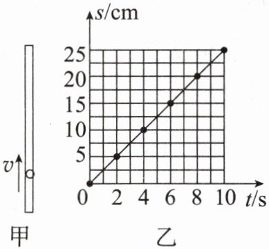 ;用测量的数据画出的s-t图像如图乙所示,分析图像中的信息可以得出的结论是气泡做匀速直线运动(或气泡的速度是 2.5 cm/s)