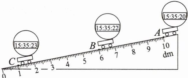 7. 如图所示,小明在测平均速度的实验中,使小车从斜面 A 点由静止滑下,经过 B 点到达 C 点,图中已经标出小车经过 A、B、C 三点时对应的时刻。下列说法正确的是(