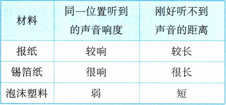 。| 材料 | 同一位置听到的声音响度 | 刚好听不到声音的距离 |