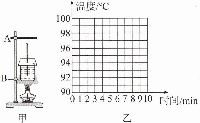 (选填“A”或“B”)。(2)调整好器材后,用酒精灯给水加热,在水温升高到90℃后,每隔1min记录一次温度,直到水沸腾并持续一段时间。将测得的数据记录在表格中,请根据表格数据在图乙中描点后画出水沸腾前后温度与时间的关系图像。