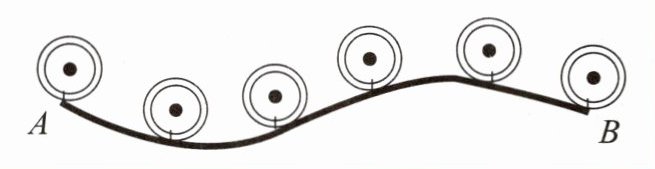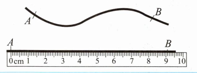 | 化曲为直法 | 用于测量弯曲物体的长度。如图所示,测量一条曲线的长度时,将一条无弹性的棉线重叠在曲线上,在棉线上曲线的两端点的位置作出相应的标记 $A$、$B$, 将棉线拉直,用刻度尺测量出两标记间的长度,即曲线的长度 |