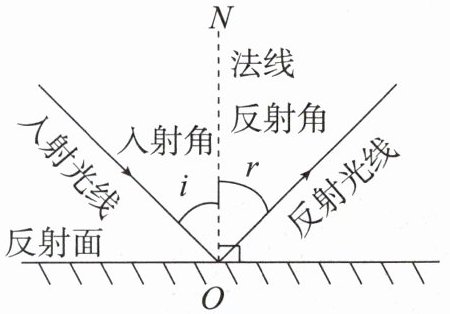 1. 认识光的反射现象中的三线、两角,如图所示。