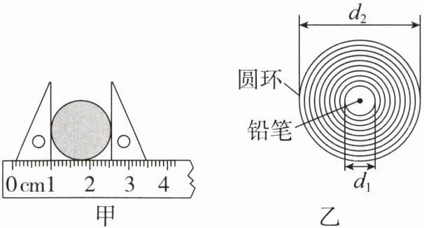 (2)一条纸带厚薄均匀,他把纸带紧密地环绕在圆柱形铅笔上,直至恰好能套进一个圆环内,如图乙所示,纸带环绕了 $n$ 圈,则纸带厚度是____(