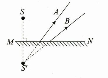 7. 如图所示,点光源S放在平面镜前,A、B为点光源S发出的光经平面镜MN反射后的两条反射光线,请通过作图确定点光源S和它的像S'的位置。