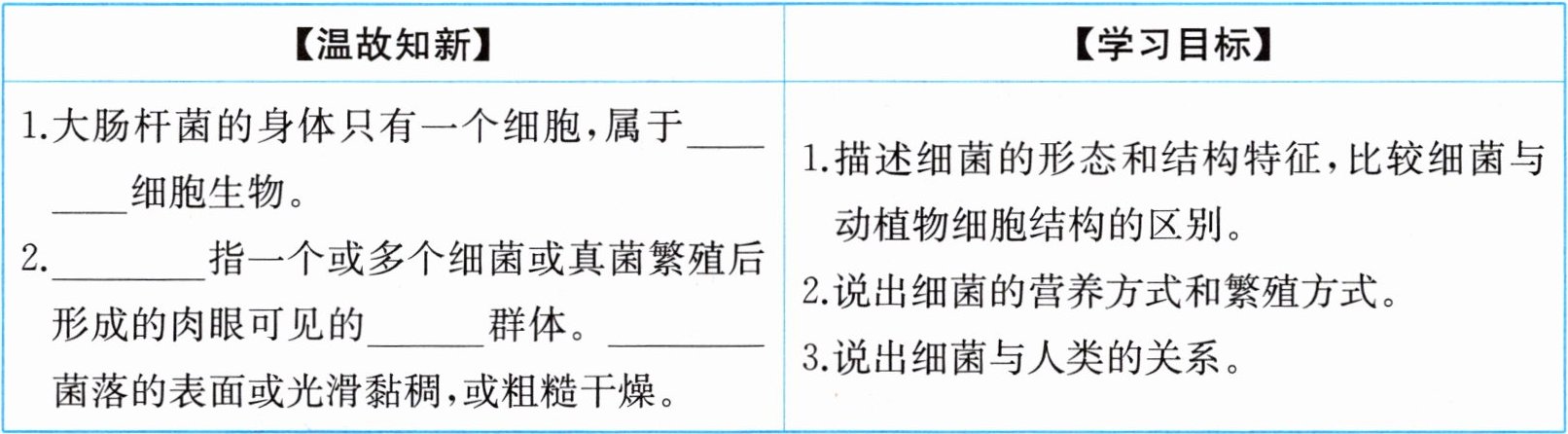 2.______指一个或多个细菌或真菌繁殖后形成的肉眼可见的______群体。______菌落的表面或光滑黏稠,或粗糙干燥。|1.描述细菌的形态和结构特征,比较细菌与动植物细胞结构的区别。