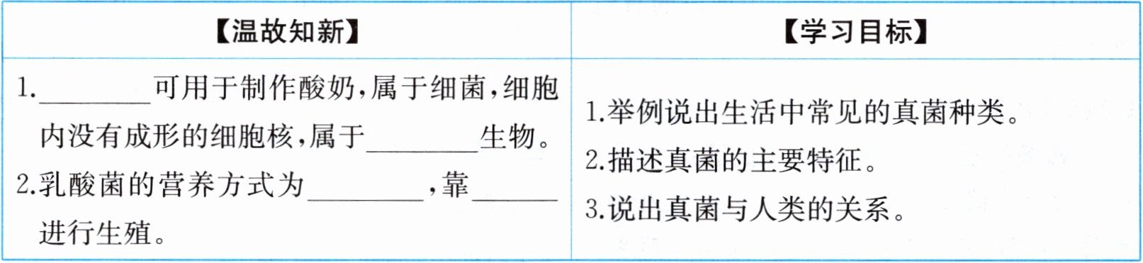 2.乳酸菌的营养方式为____,靠____进行生殖。|1.举例说出生活中常见的真菌种类。